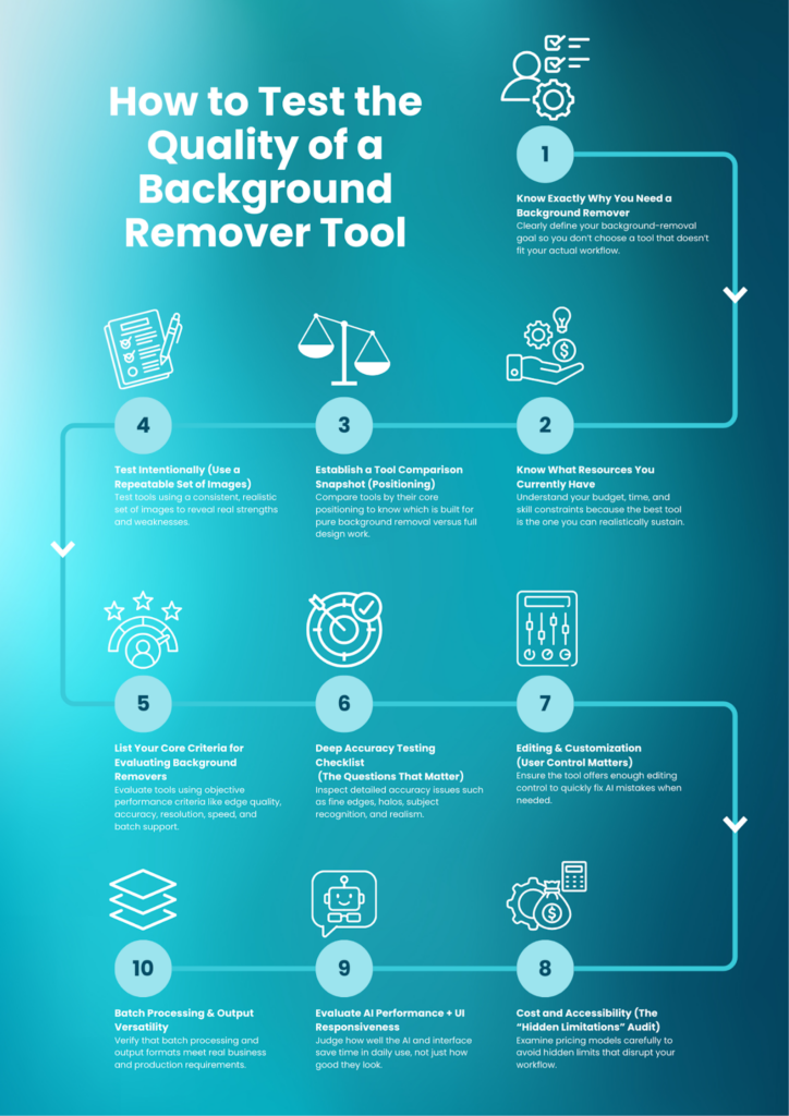 This guide is your complete review framework for these background remover tools. You can also get the link to copy and print a checklist to help you with the tests. This is a step-by-step way to check, benchmark, and compare background remover tools so that you can confidently pick the one that fits your business needs.