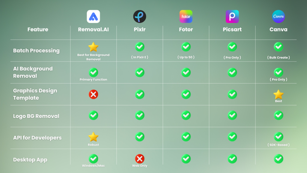 • Pixlr, Fotor, Picsart sit between editing + background removal and can be good for mixed creative workflows.
