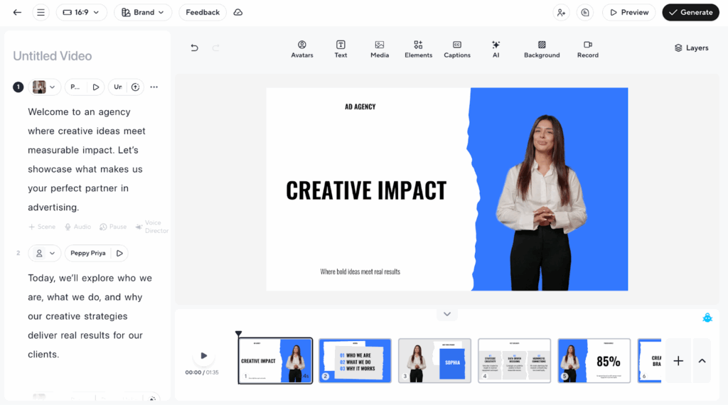 HeyGen offers an intuitive web-based interface where you can customize avatars, add backgrounds, overlays, and subtitles, and even translate videos automatically for global audiences. It’s ideal for marketing, training, and explainer videos where speed and consistency matter more than complex timeline editing.